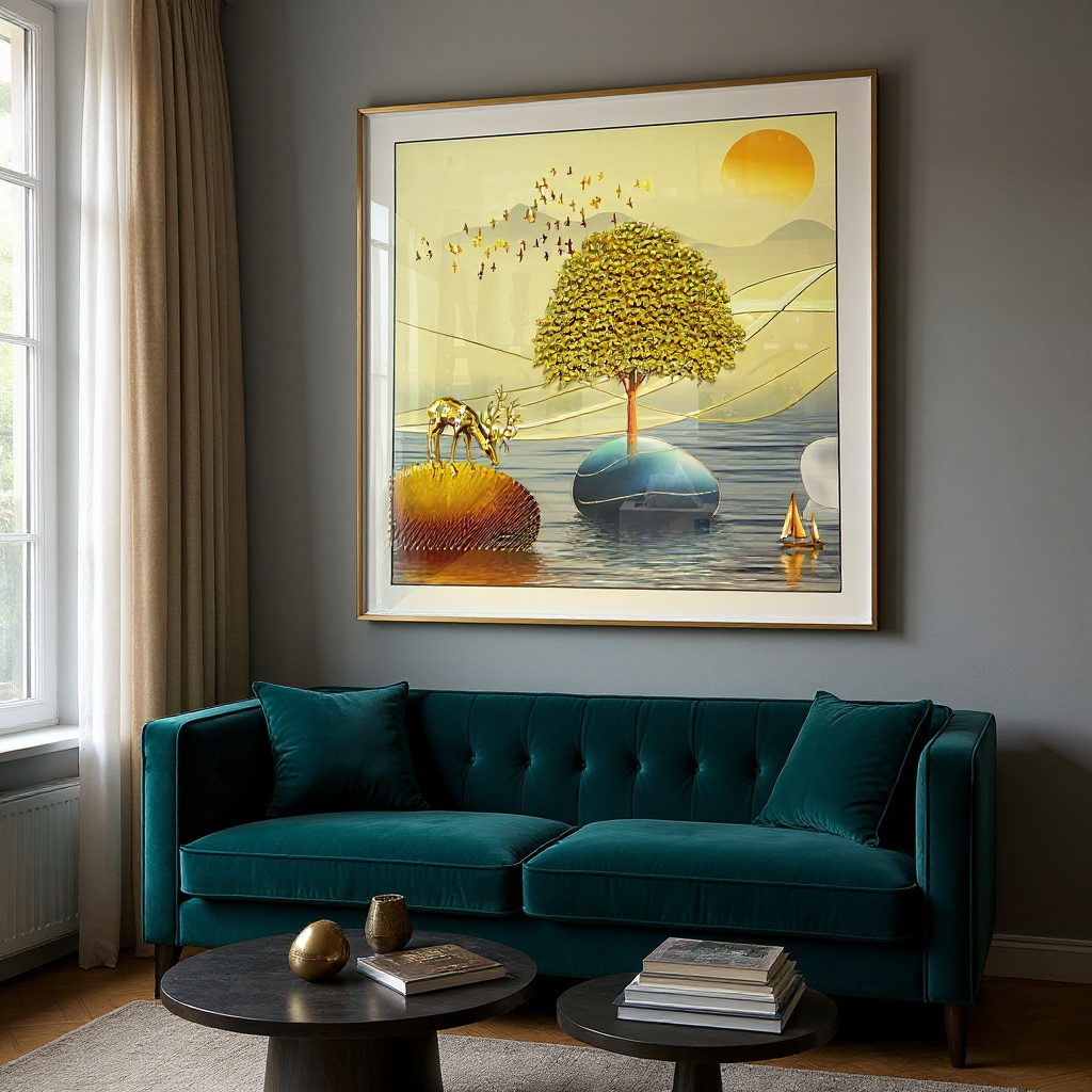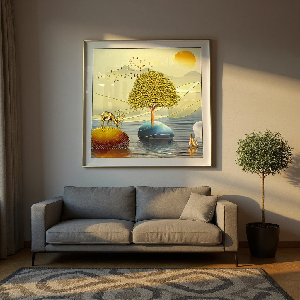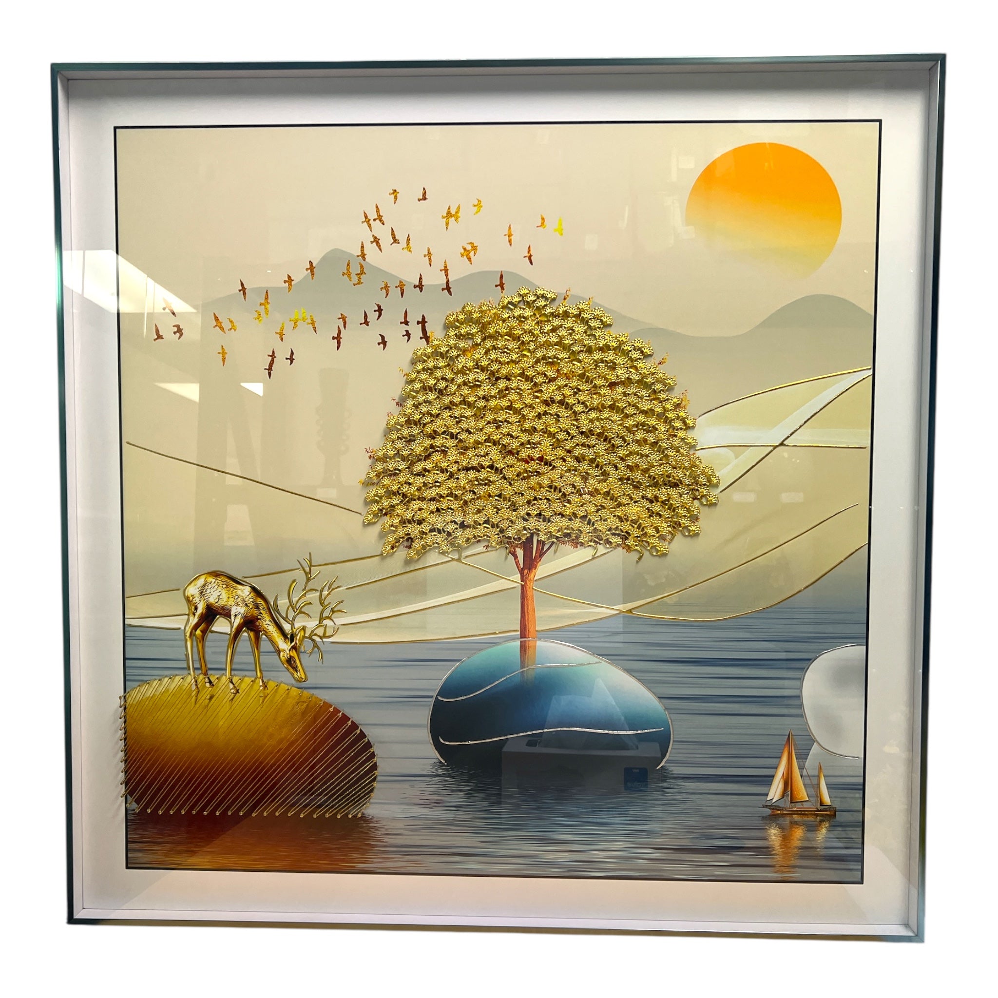 Bring elegance and tranquility to your space with this stunning framed artwork. Featuring a golden tree in full bloom, a graceful deer, and a flock of birds soaring under a warm sun, the piece beautifully blends nature’s harmony with modern artistry. The reflective waters, sailboats, and layered mountains in the background add depth and serenity, making it a perfect centerpiece for living rooms, bedrooms, or offices. Crafted with fine detail and vibrant metallic accents, this artwork radiates sophistication and calm.