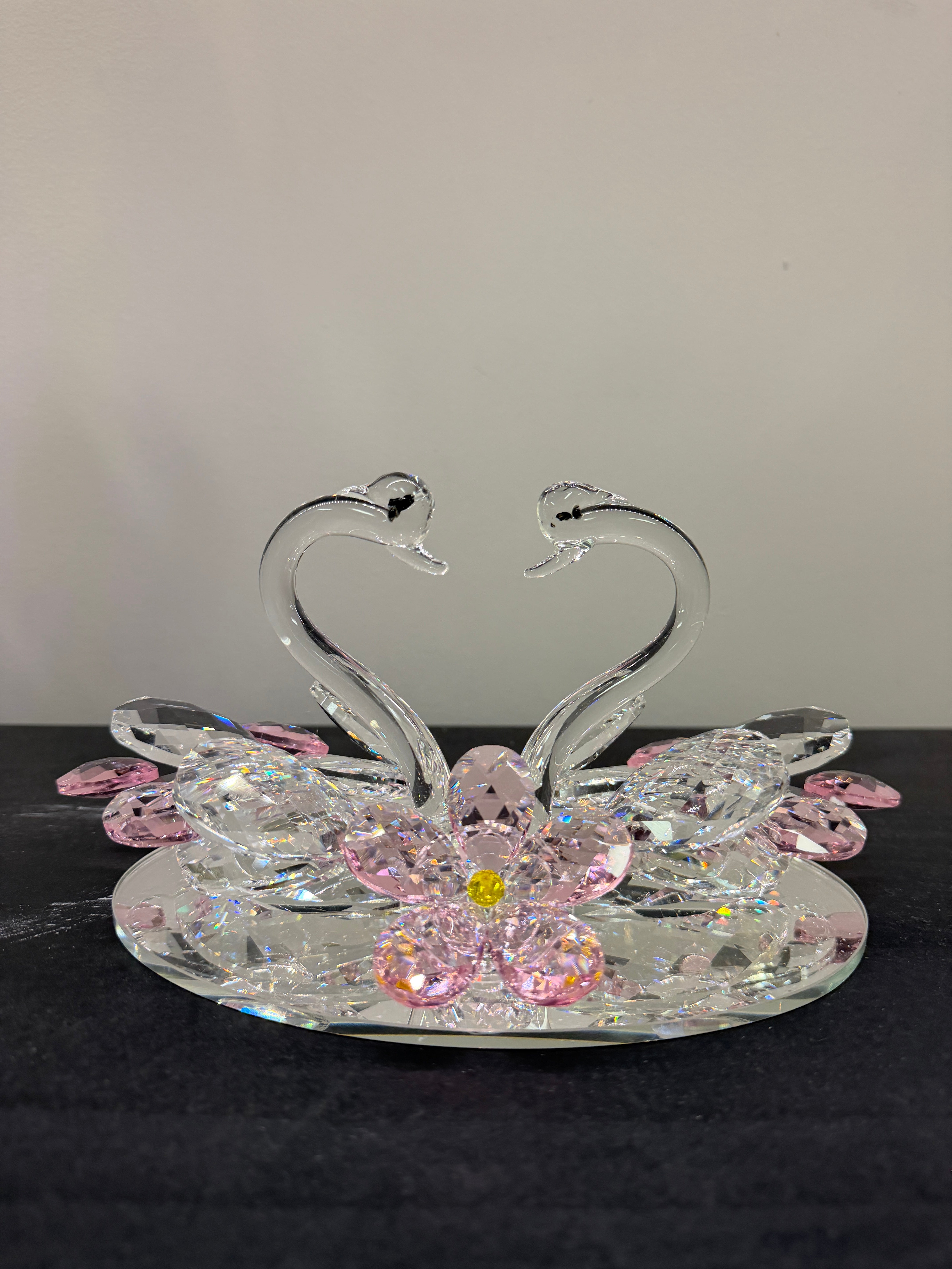 Two finely sculpted crystal swans face one another forming the shape of a heart, their curved forms meeting in perfect harmony as a delicate crystal flower rests between them. Cut to shimmer under light, this elegant piece symbolizes devotion, balance, and everlasting beauty.