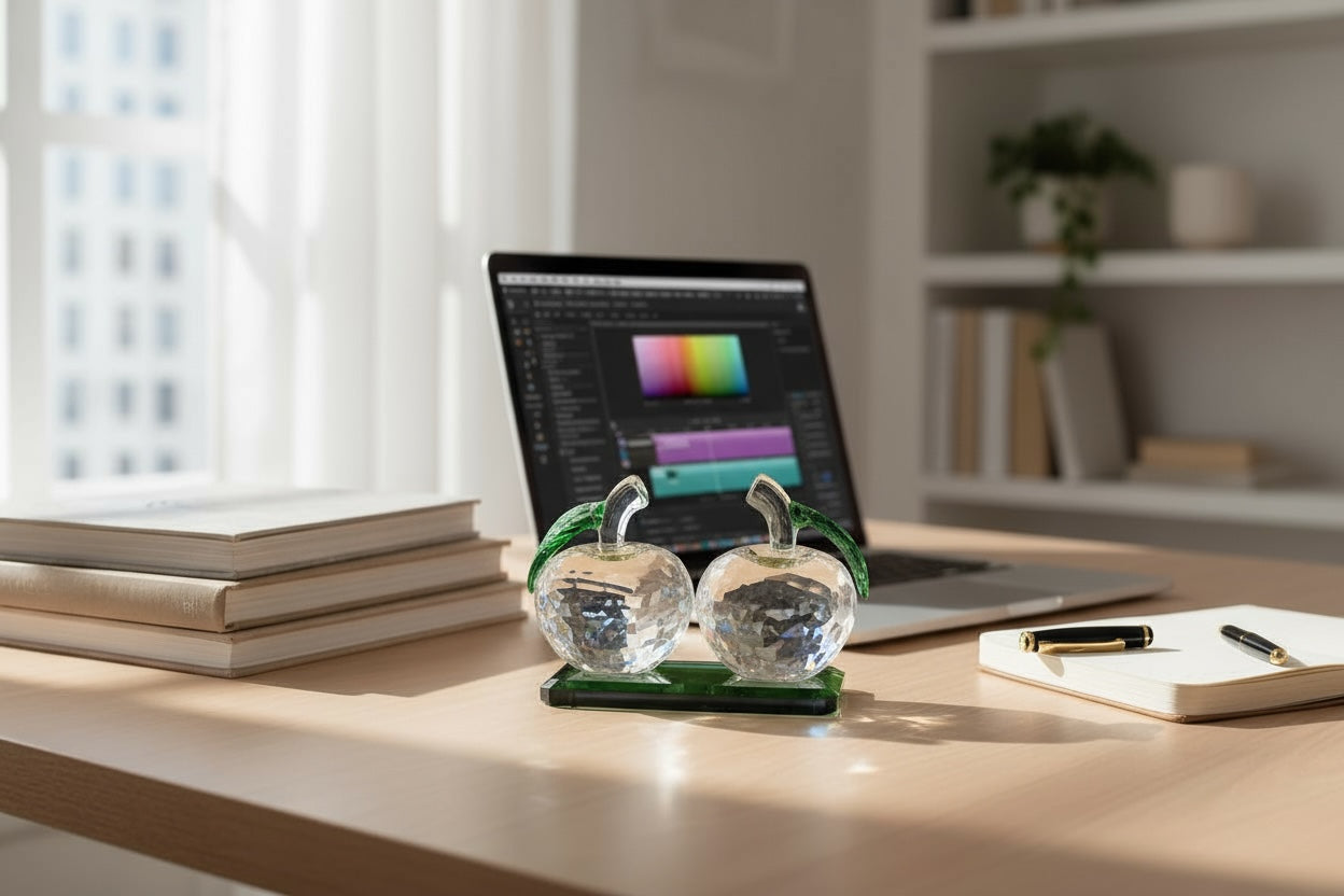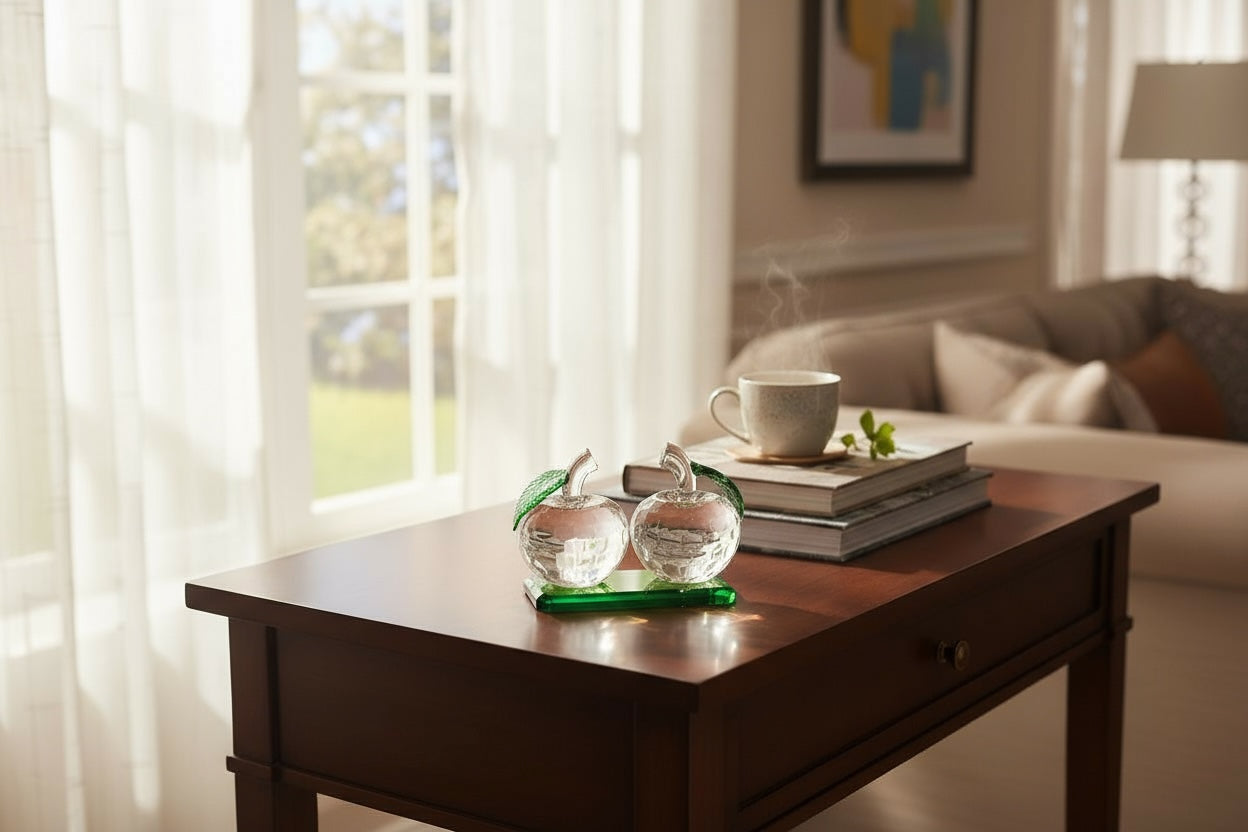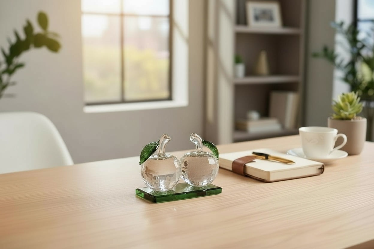 This dazzling crystal apple duo radiates elegance and sophistication. With masterfully cut facets and delicate green stems, it symbolizes prosperity and harmony—an exquisite decorative piece that brings a touch of luxury to any setting.